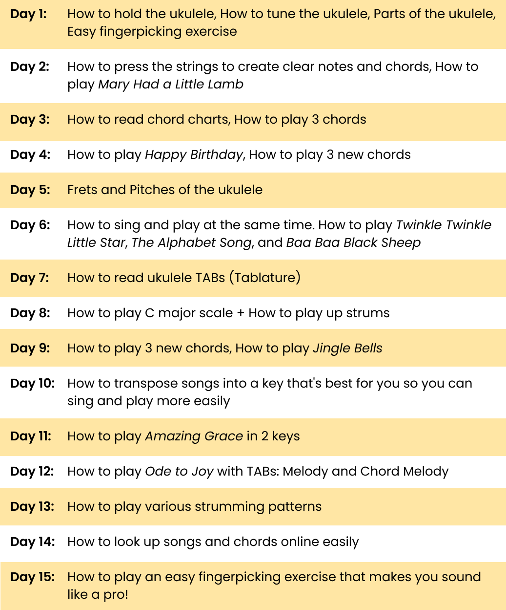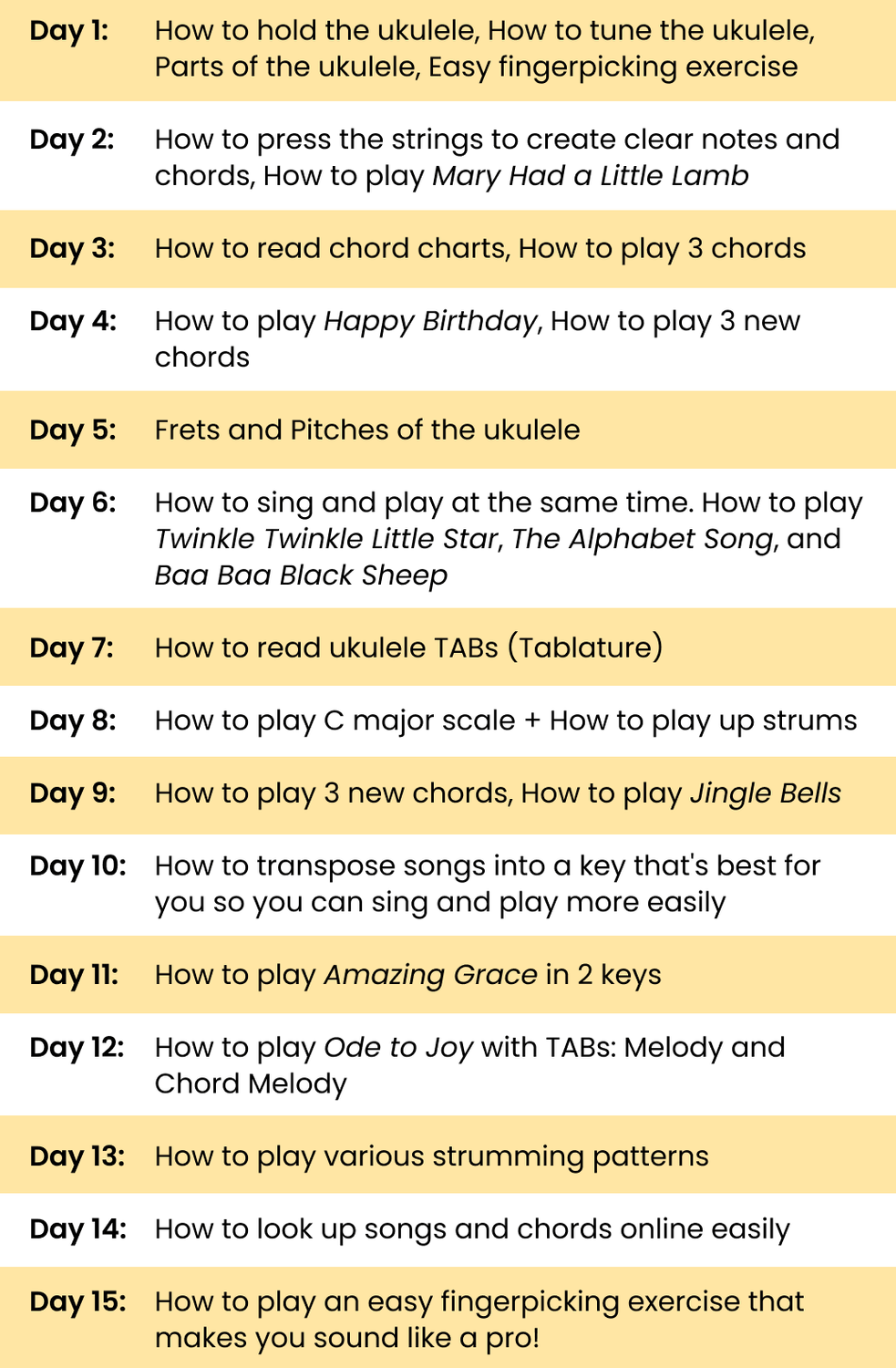 Whether you’re looking to play songs with your friends and family or just enjoy a new hobby, this course is the easiest way to start playing ukulele with confidence in just 15 Days!