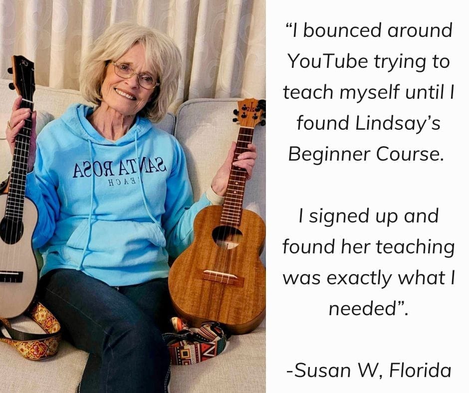 "Lindsay, I appreciate you. Your teaching style, videos, and responses are excellent. I can play and sing and strum my ukulele!” – Margie, USA