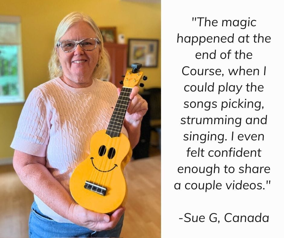 "I took Lindsay's Ukulele Course for Total Beginners last year and it was the best thing I ever did. I'm now a member of my local ukulele group and for the first time this coming July, I'll be GIGGING! Never in a million years did I think I would be a) good enough or b) have the confidence. If you're wondering if Lindsay can help, YES SHE CAN. Just go for it!” – Beverly, UK